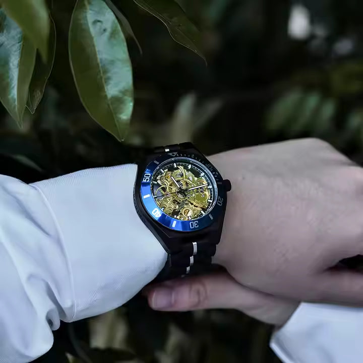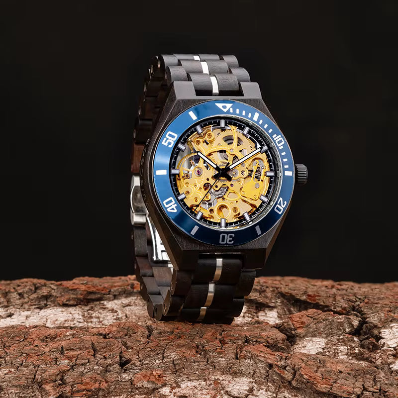שעון מכני בעיצוב מינימליסטי, עשוי עץ טבעי ומשלב פונקציית סטופר למדידת זמן.