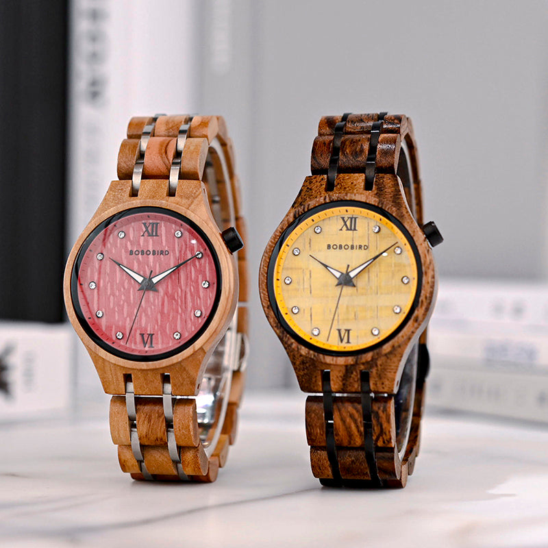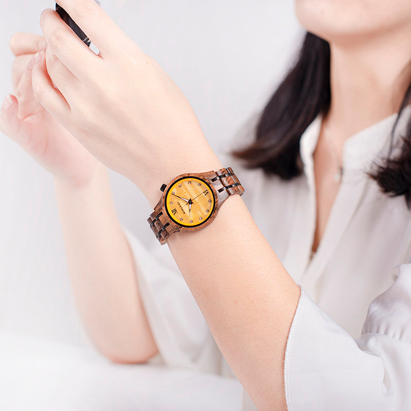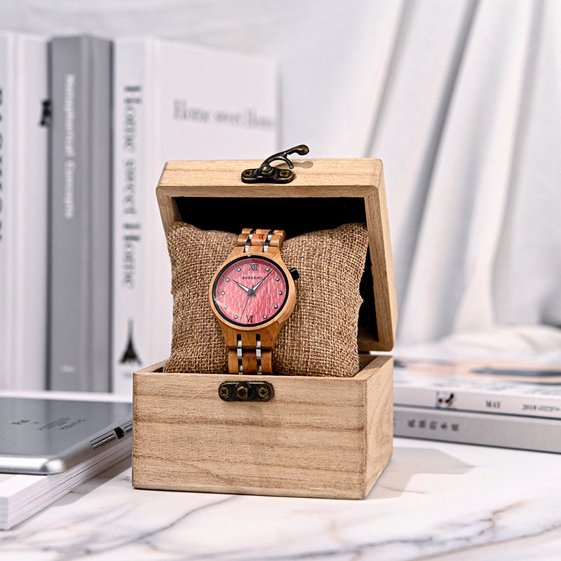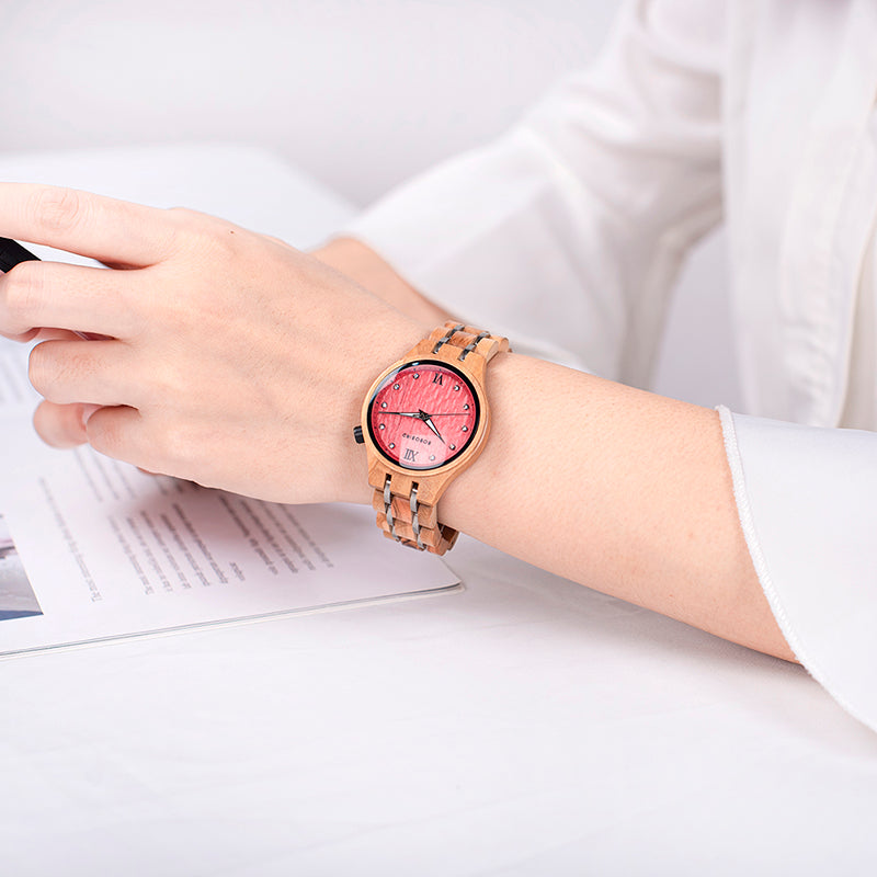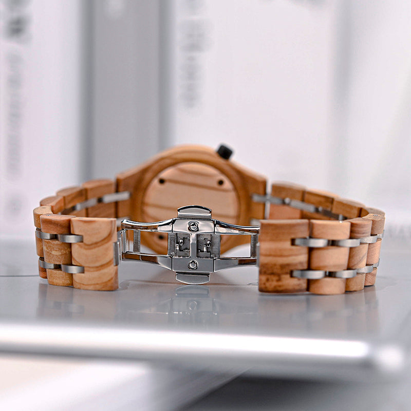 שעון קוורץ בעבודת יד עם גוף ורצועה מעץ טבעי, בעיצוב נשי עדין ומוקפד.